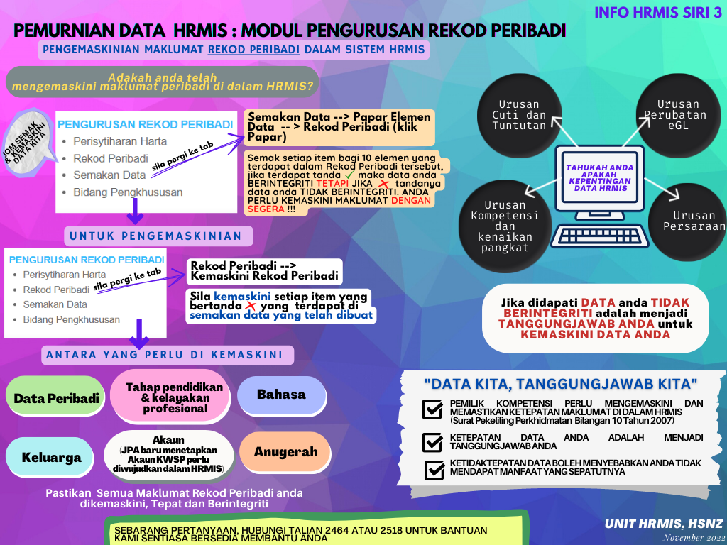Oleh yang demikian mohon kerjasama YBhg Dato/ to'Puan/ Tuan/ Puan, untuk mengemaskini maklumat rekod peribadi dalam sistem HRMIS bagi:-